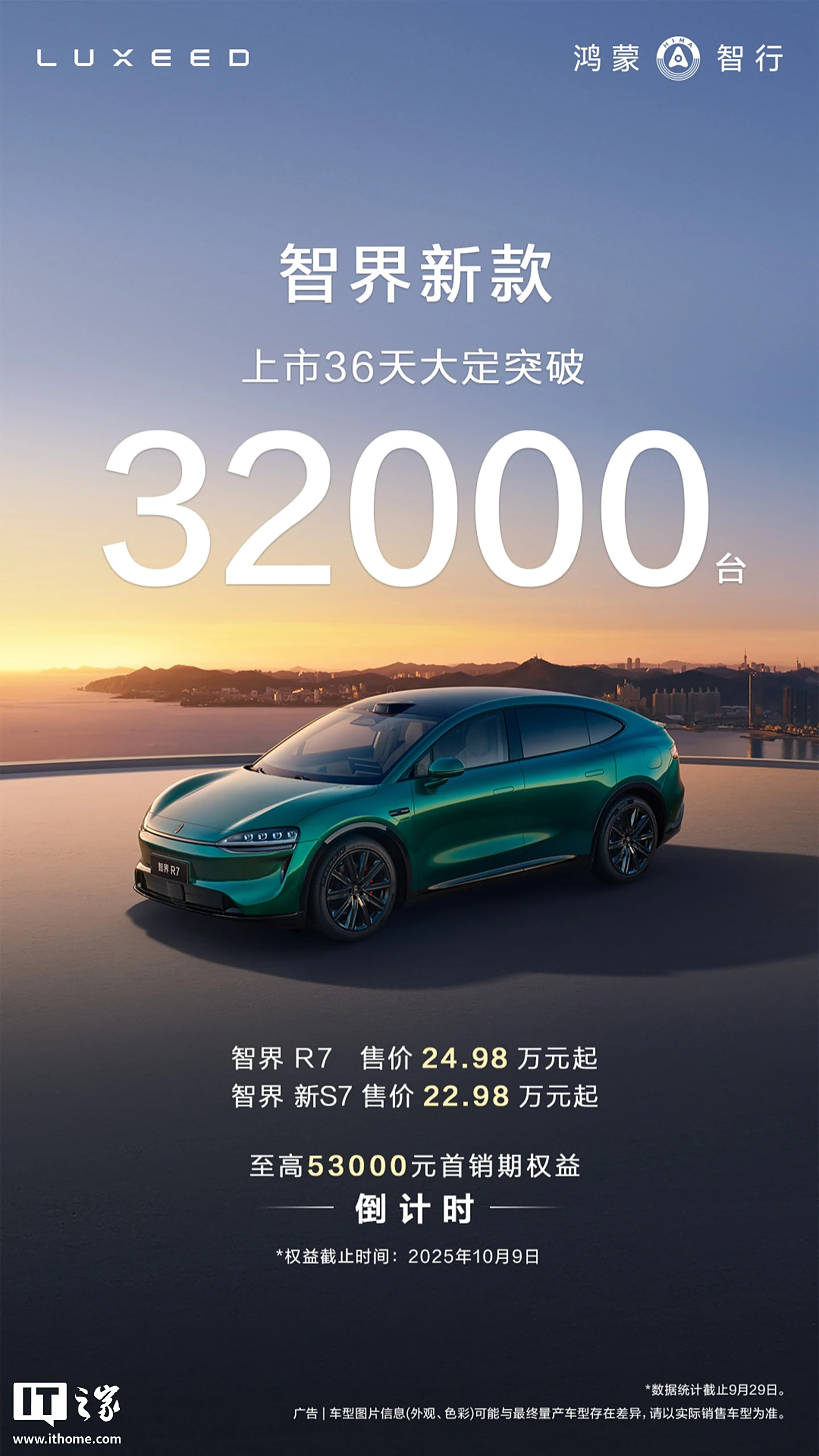 IT之家 9 月 30 日消息,鸿蒙智行智界汽车官方微博刚刚宣布,新款智界 R7、智界新 S7 汽车上市 36 天大定突破 32000 台。