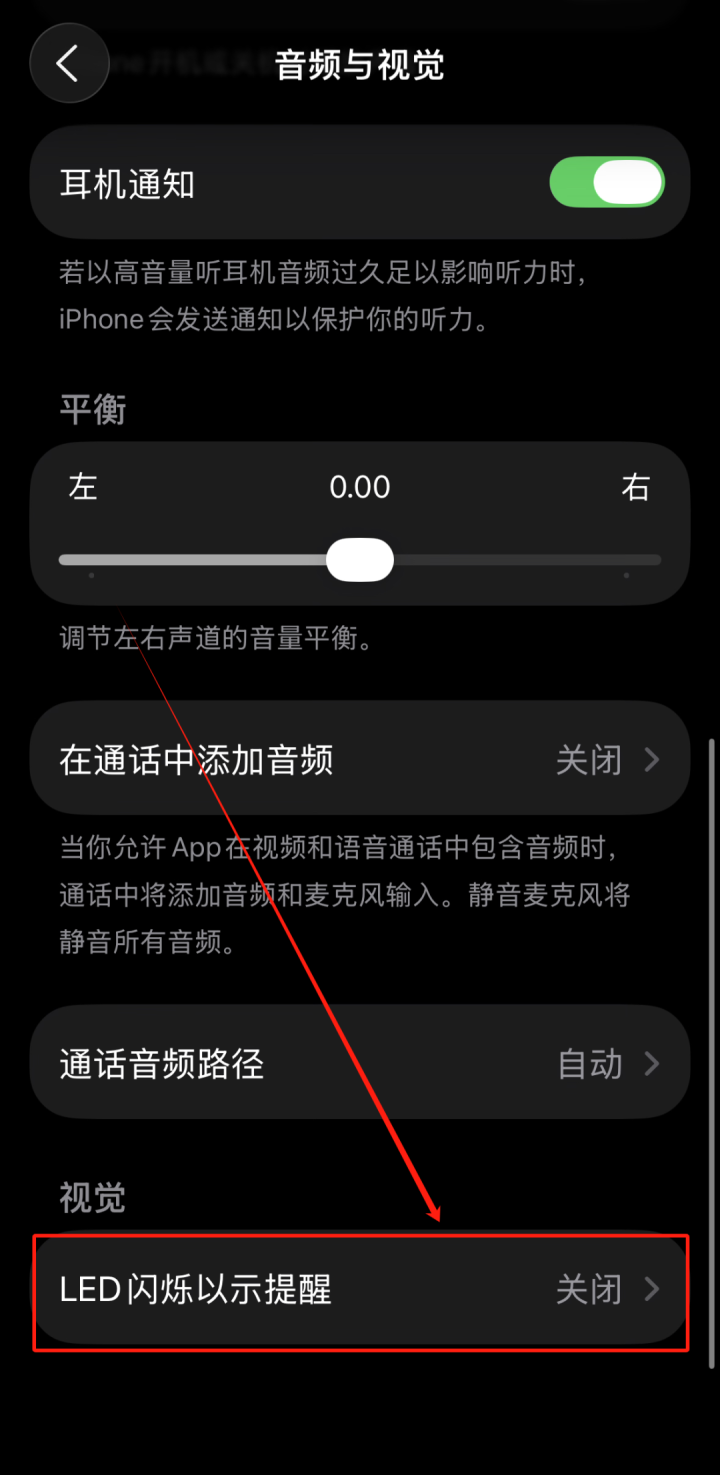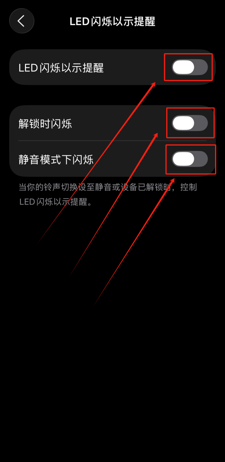 打开“LED闪烁以示提醒”、“解锁时闪烁”、“静音模式下闪烁”后的滑动开关即可。
